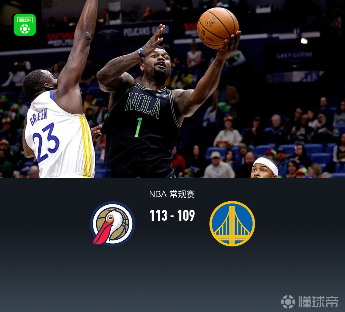 北京时间2月25日NBA 常规赛,新奥尔良鹈鹕对阵金州勇士。首节鹈鹕便建立12分领先,次节防守拉锯勇士追至个位数分差,半场鹈鹕46-39勇士,下半场勇士多次反超比分,但末节鹈鹕再度领先两位数,勇士梅尔顿冲框一度追至3分差,但没能继续把握机会追分,最终鹈鹕113-109勇士。