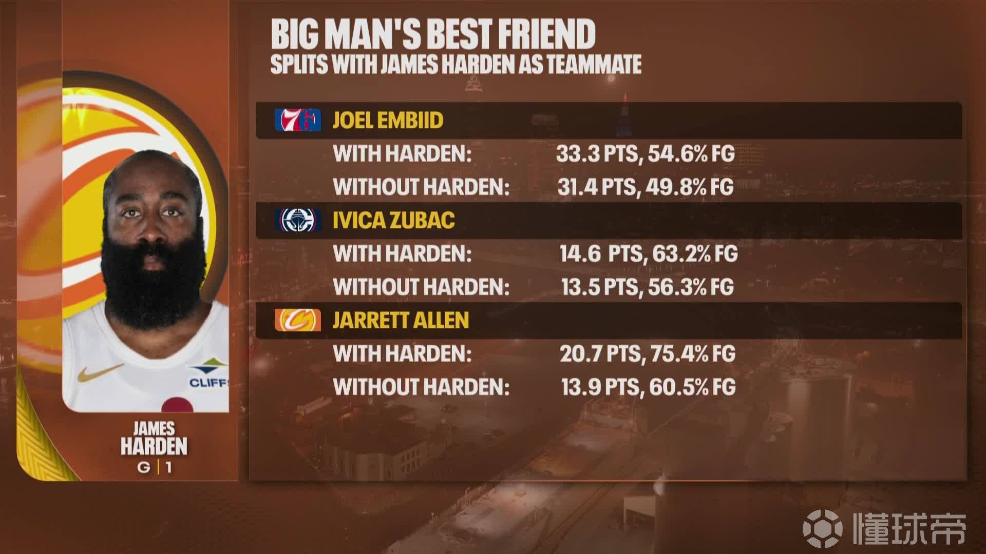 与哈登搭档时:20.7分,命中率75.4%