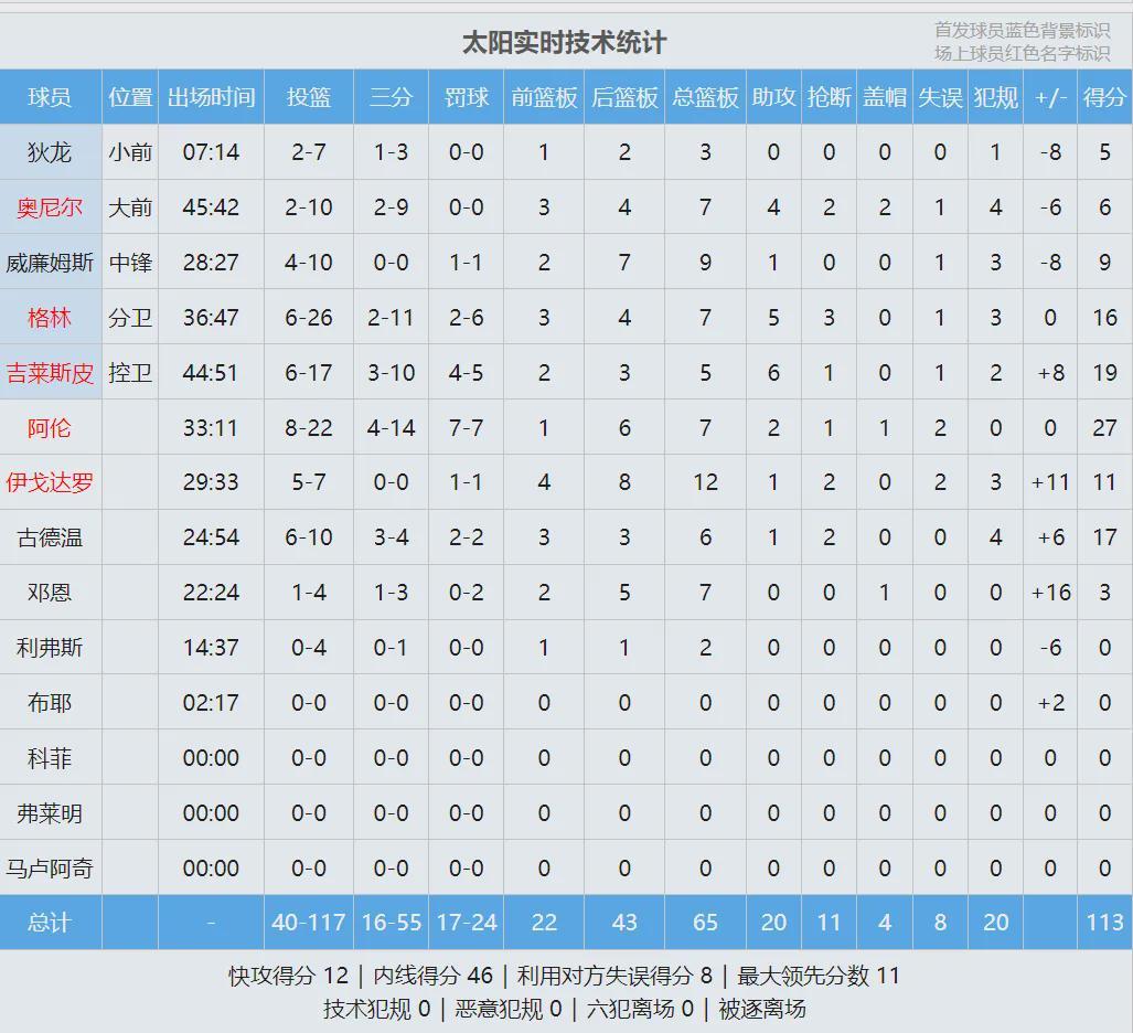 此役太阳投篮命中率34.2%,三分命中率29.1%,罚球命中率70.8%,真实命中率44.3%。本赛季NBA所有获胜球队当中,太阳本场投篮和真实命中率都是最低的。此役过后,太阳33胜24负仍居西部第七,领先第八勇士3.5个胜场。