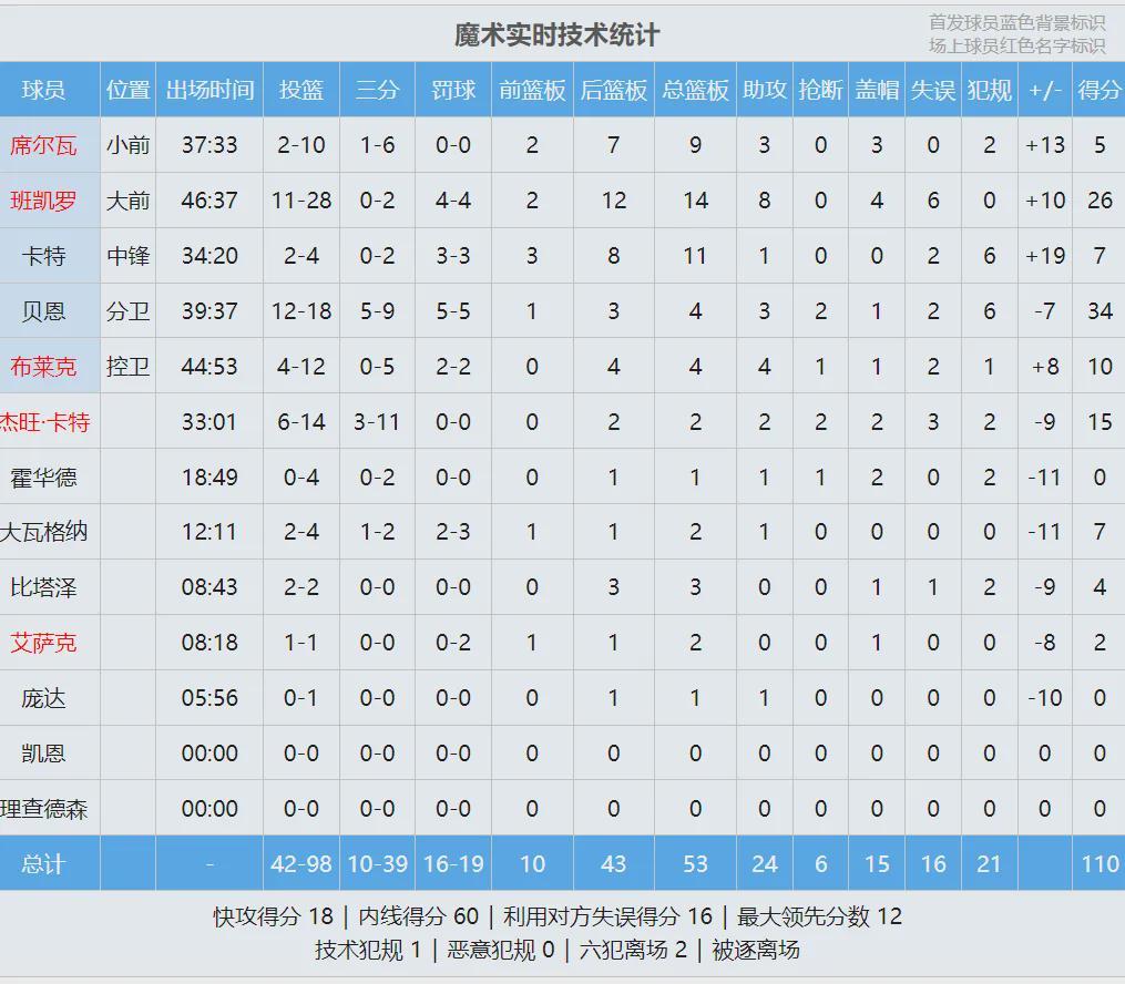 再看看魔术这边,贝恩是全队状态最好的,无奈第一个加时赛6犯离场。本场比赛,贝恩18投12中,三分9中5,罚球5中5,砍下34分4板3助2断!魔术状元班凯罗28投11中,三分2中0,罚球4中4,拿到26分14板8助4帽6失误。