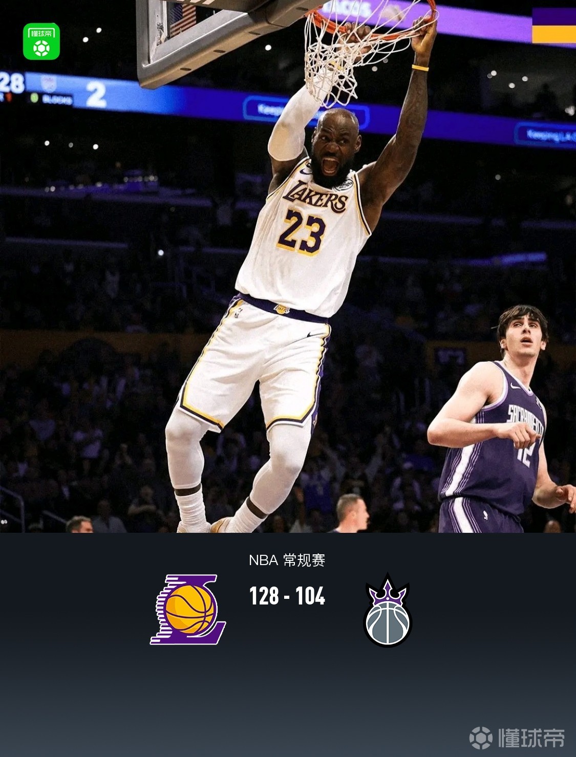第四节,前半节湖人詹姆斯带领替补联手肯纳德、克莱伯将分差拉大接连30分,后半节湖人直接收兵换下主力,进入练兵时间,最终湖人128-104战胜国王.