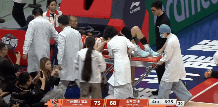 比赛进行到第四节时,广州龙狮队球员郭艾伦在一次突破对抗后意外伤及膝盖。倒地瞬间,他下意识用手握住左腿膝盖,表情痛苦。随后,现场医疗人员迅速进场,用担架将他抬离场地。