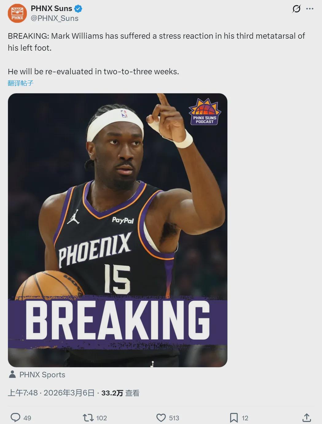 此役过后,太阳35胜27负仍居西部第7,落后第6的湖人2个胜场,领先第8的勇士3个胜场。今天赛前,太阳官方宣布:球队中锋马克-威廉姆斯左脚第三跖骨出现应力反应,将在2-3周之后接受重新评估。常规赛能否复出,都是未知数。
