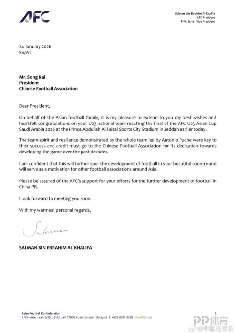 萨尔曼在来函中表示:“主教练安东尼奥率领的队伍在比赛中展现出了极强的团队精神与坚韧品格,正是队伍在本届赛事中取得优异成绩的关键所在。此项成就也应归功于中国足球协会过去数十年来为推动中国足球事业发展所付出的不懈努力。”同时,他确信中国队在U23亚洲杯上取得的突破将进一步助力中国足球事业的发展。