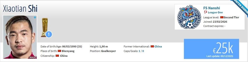 北京时间2月23日,德转更新,原辽宁铁人门将石笑天加盟佛山南狮。