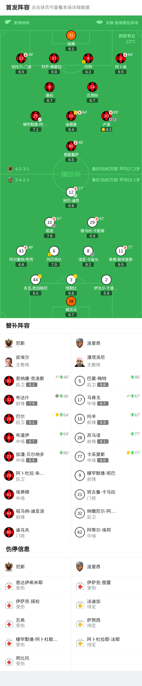 北京时间2月23日法国足球顶级联赛第23轮,尼斯主场对阵洛里昂。比赛中,尼斯球员卢谢接队友助攻率先破门,随后在上半场补时阶段再入一球完成梅开二度;布达什则在比赛进程中接队友助攻打入球队第三球。洛里昂方面,帕吉在上半场补时阶段扳回一球,班巴-迪昂通过点球建功,下半场补时阶段诺亚-卡迪乌接队友助攻打入球队第三球。最终两队战成3-3平。