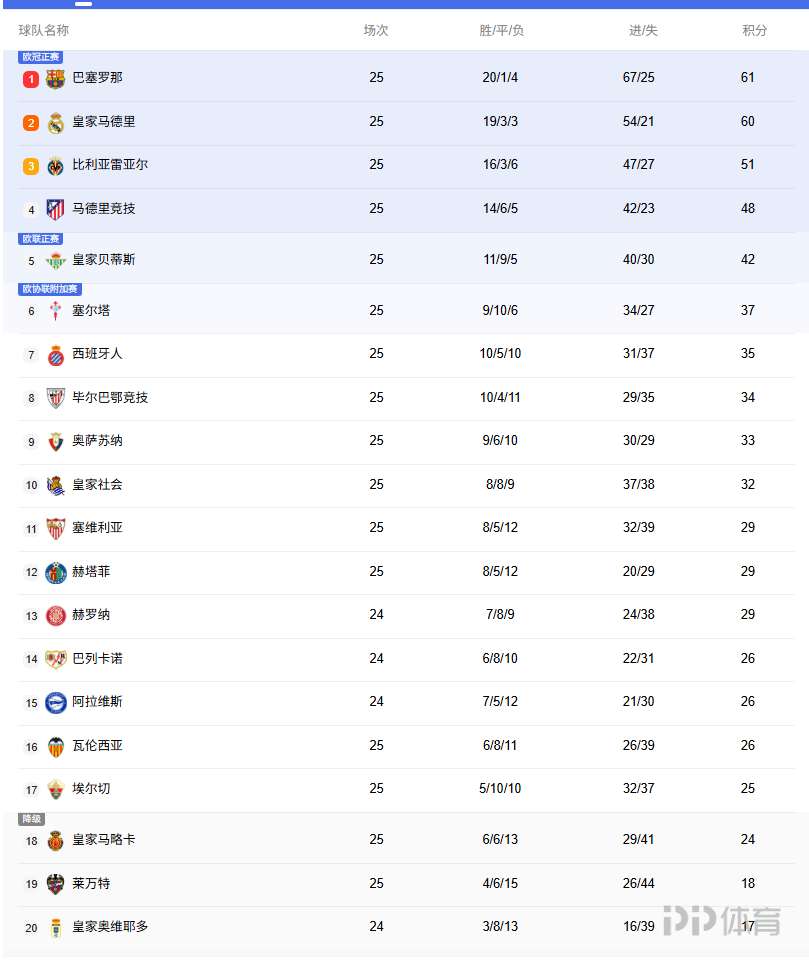 西甲第25轮,巴萨3-0战胜莱万特,皇马1-2不敌奥萨苏纳!巴萨终结各赛事两连败,积61分重回榜首,领先第2名皇马1分。