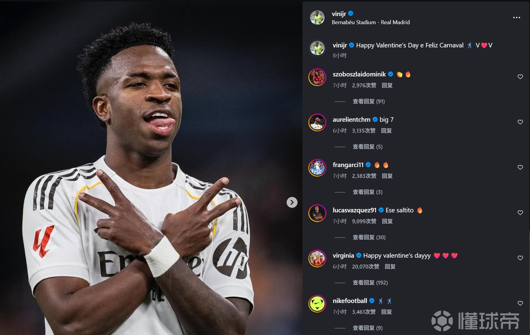 西甲第24轮,皇马主场4-1大胜皇家社会,维尼修斯表现抢眼,制造两粒点球并亲自操刀命中。赛后,他在社交媒体上晒照庆祝胜利,引发队友和好友纷纷留言。