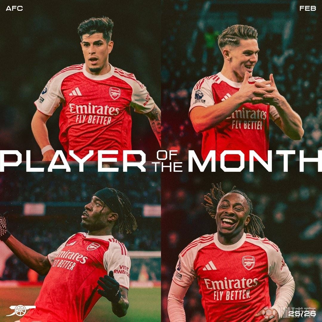 阿森纳官方公布了2月份队内最佳球员的候选名单,因卡皮耶、哲凯赖什、马杜埃凯、埃泽在列。