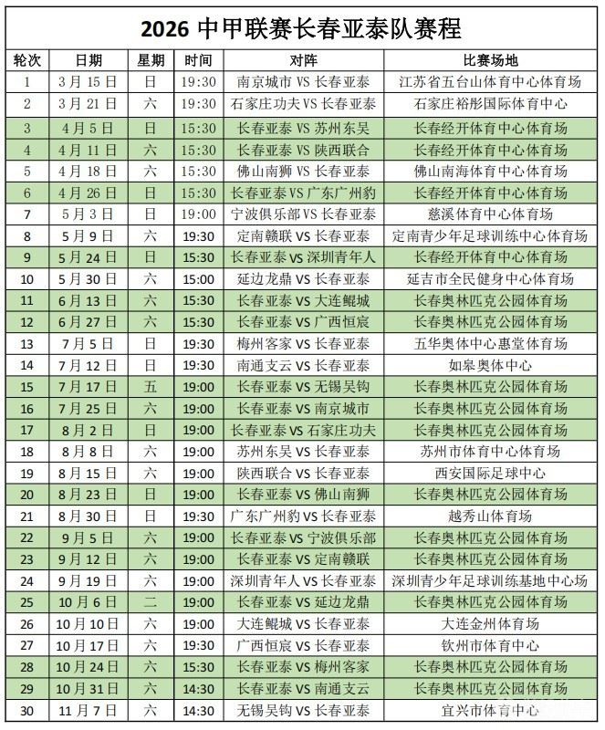长春市因承办2027年第33届世界大学生冬季运动会,长春体育中心体育场(南岭)将进行施工改造。长春亚泰新赛季前4个主场将移至长春经开体育中心体育场。6月13日开始,其余11个主场将在长春奥林匹克公园体育场进行。