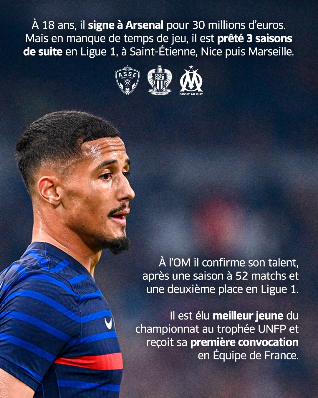 18岁时,萨利巴以3000万欧元高价加盟阿森纳,不过由于缺乏出场时间,他被先后回租到圣埃蒂安、尼斯和马赛,在马赛,萨利巴证明了自己的天赋,单季52次出场,入选法甲最佳阵容,也入选了法国国家队。此外,他也是2021-22赛季的法甲最佳年轻球员。