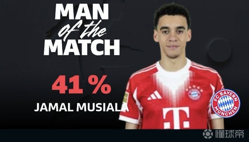 最终经过德甲官网球迷投票,穆西亚拉以41%的得票率力压路易斯-迪亚斯(29%),当选全场最佳球员。