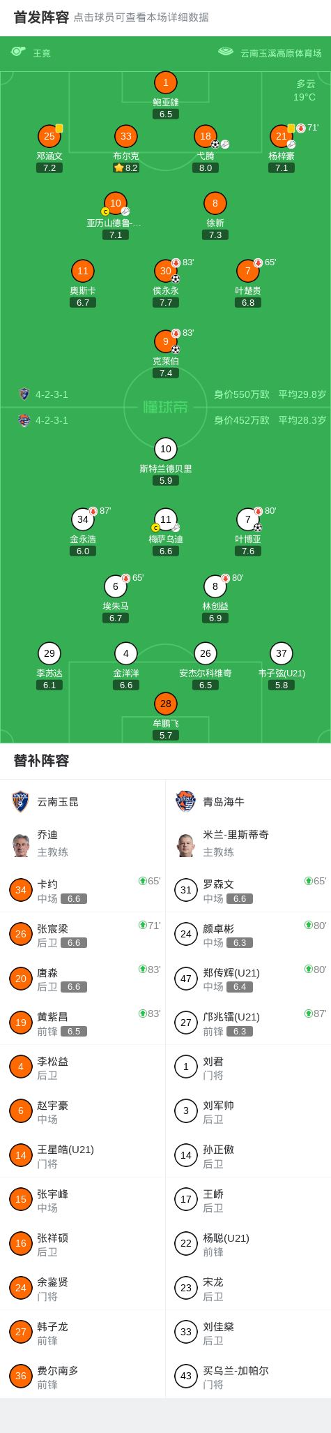 北京时间3月7日19:35,中超第1轮,云南玉昆主场对阵青岛海牛。上半场,克莱伯、弋腾、侯永永先后破门得分;下半场,叶博亚扳回一城,小将邝兆镭替补登场上演中超首秀。最终云南玉昆3-1战胜青岛海牛。