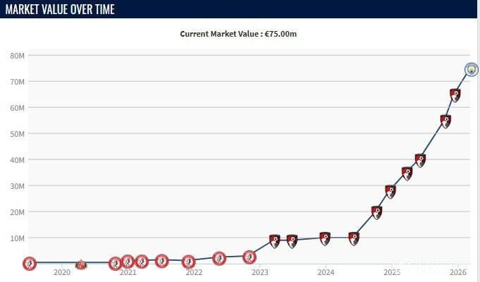 在23-24赛季结束后,塞门约的身价为1000万欧元,自那之后,凭借自己在伯恩茅斯的出色表现,他的身价开始连续上涨,到现在已经完成了7连涨,两年内,从1000万欧元上涨至7500万欧元。