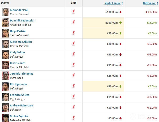 • 利物浦11人身价变更:索博1500万欧涨幅最大,伊萨克跌幅最大