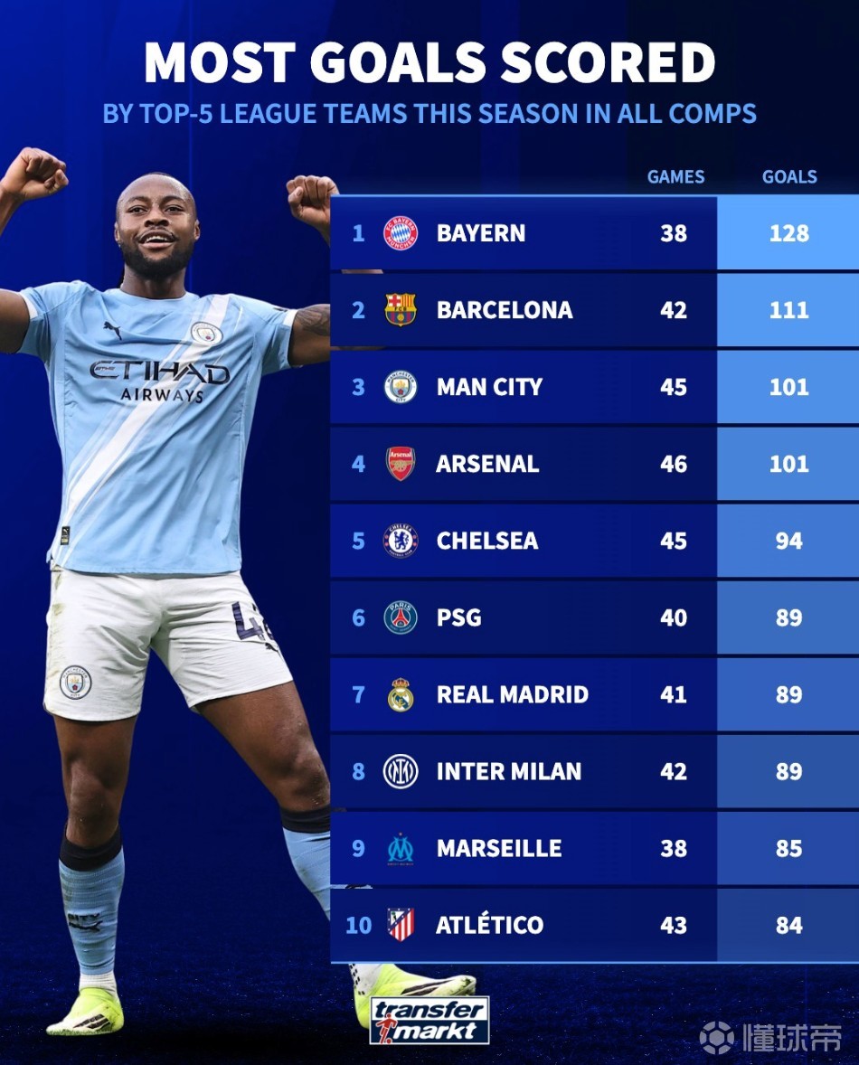 • 本赛季五大联赛球队进球榜:拜仁128球第1,巴萨第2,曼城第3